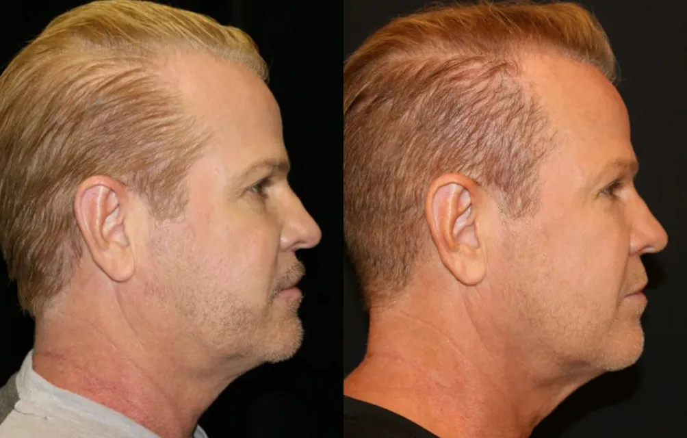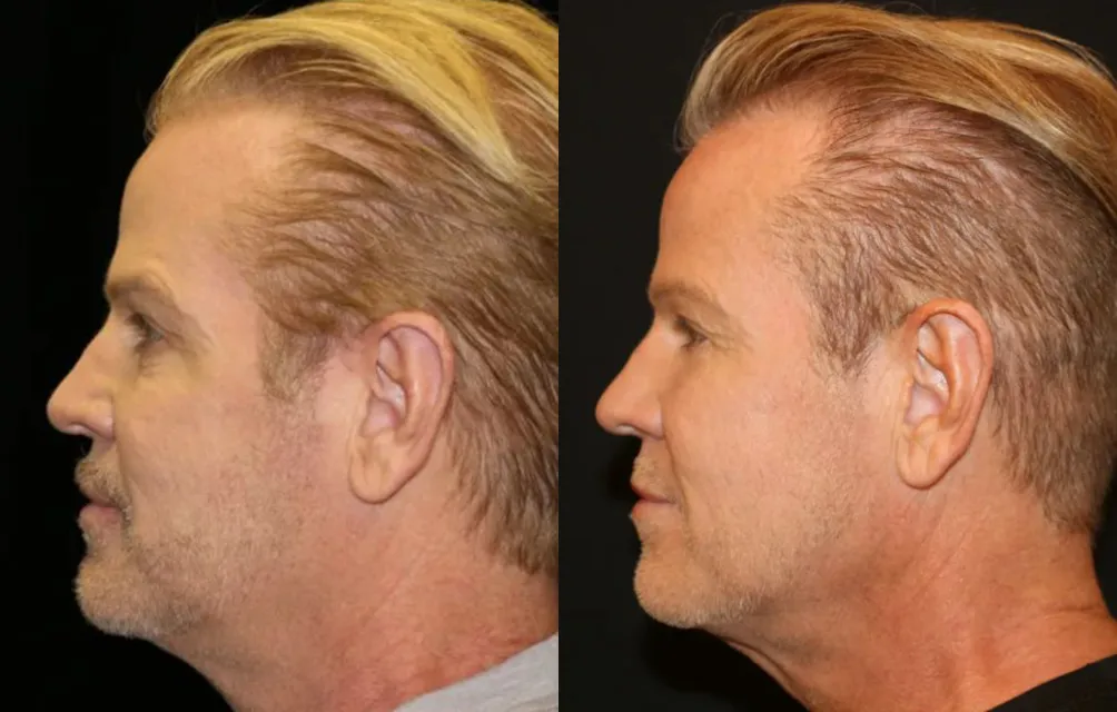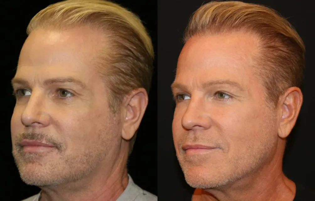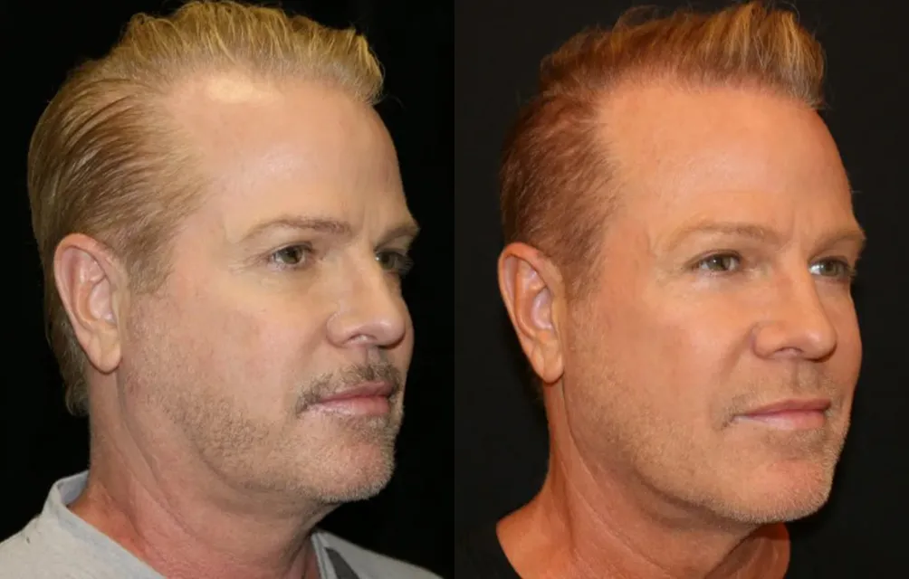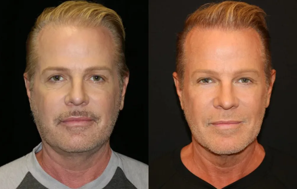 54 year old male, unhappy with the aging appearance to the mid-face – specifically the loose skin to the lower eyelids and loss of volume to the tear trough-cheeks junction, desiring a more youthful appearance. A lower blepharoplasty skin pinch removal was performed along with fat grafting to the undereye-tear trough-upper cheek region. Results show a more awake and energized appearance, tight lower eyelid skin, and improved volume to the mid-face region for a more refreshed and rejuvenated appearance.